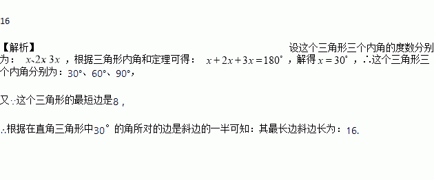 如果一个三角形的三个内角之比是1∶2∶3,且最小边的长度是8,最长边的长度是________.