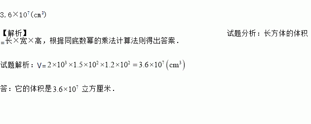 3.6×107(cm3) 【解析】试题分析:长方体的体积=长×宽×高,根据同底数幂的乘法计算法则得出答案. 试题解析:V= 答:它的体积是立方厘米.