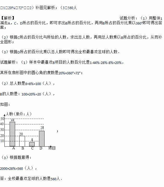 (3)己知该校有2000人,请根据样本估计全校最喜欢足球的人数是多少?