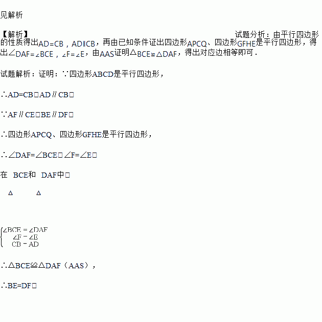 如图,四边形ABCD是平行四边形,作AF∥CE,BE∥DF.