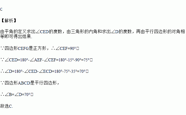 如图,有一平行四边形ABCD与一正方形CEFG,其中E点在AD上.若∠ECD=35°,∠AEF=15°,则∠B的度数为何?( )