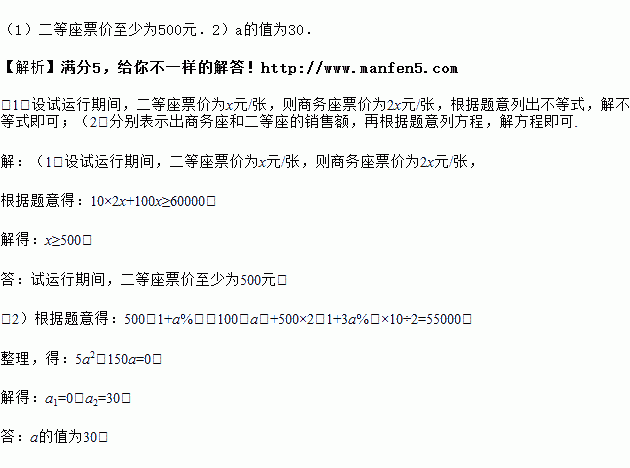 (2)现正式投入运行后,铁路部门将二等座票价在试运行首日最低票价的基础上上涨了a%(a为整数),商务座票价在试运行首日最低票价基础上提高了3a%,且正式运行首日二等座售出的数量比试运行首日减少了a张,商务座售出的数量减少为试运行首日的一半,正式运行首日商务座和二等座总销售额为55000元,求a的值.