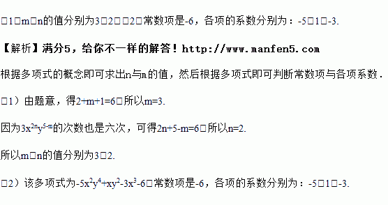 已知多项式-5x2ym+1+xy2-3x3-6是六次四项式,且3x2ny5-m的次数与它相同.