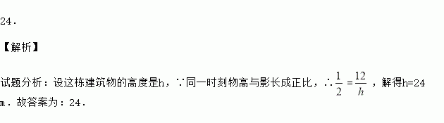 在某一时刻,测得一根高为2m的竹竿的影长为1m,同时测得一栋建筑物的影长为12m,那么这栋建筑物的高度为 m.