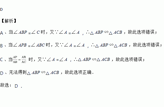 如图,点P在△ABC的边AC上,如果添加一个条件后可以得到△ABP∽△ACB,那么以下添加的条件中,不正确的是( )