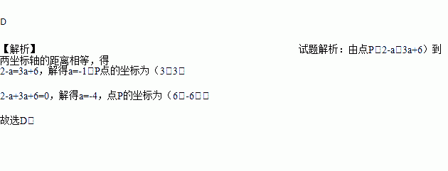 若点P(2-a,3a+6)到两坐标轴的距离相等,则点P的坐标为( )