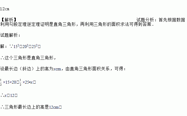 一个三角形三条边的长分别为15cm,20cm,25cm,这个三角形最长边上的高是多少?