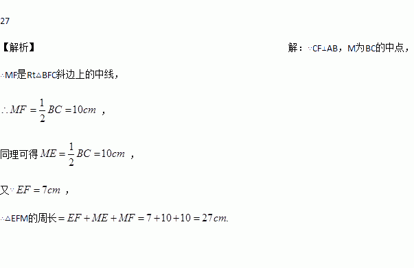 如图,在△ABC中,CF⊥AB于F,BE⊥AC于E,M为BC的中点,EF=7㎝,BC=20㎝,则△EFM的周长是 ㎝.