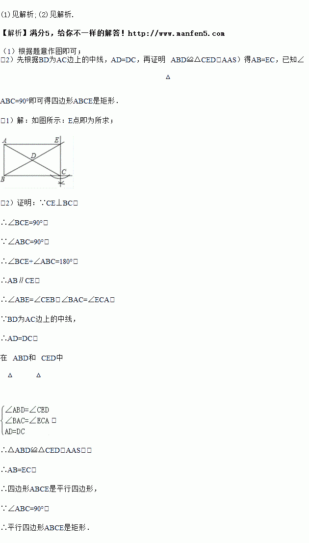 (1)按如下要求尺规作图,保留作图痕迹,标注相应的字母:过点C作直线CE,使CE⊥BC于点C,交BD的延长线于点E,连接AE;
