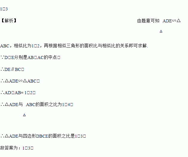 如图,点D、E分别是AB、AC的中点,则△ADE与四边形DECB的面积之比是_____.