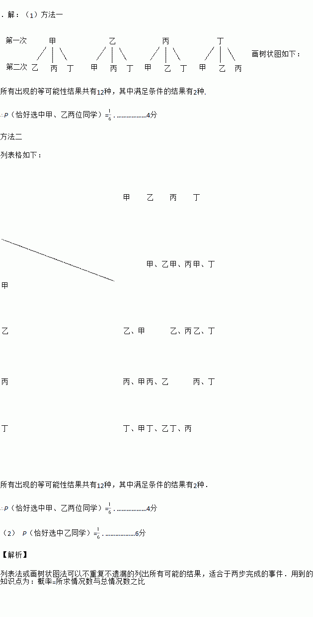 (1)请用树状图法或列表法,求恰好选中甲、乙两位同学的概率.