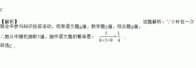 小玲在一次班会中参与知识抢答活动,现有语文题6个,数学题5个,综合题9个,她从中随机抽取1个,抽中数学题的概率是( )