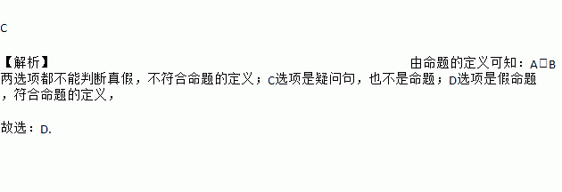 C 【解析】由命题的定义可知:A、B两选项都不能判断真假,不符合命题的定义;C选项是疑问句,也不是命题;D选项是假命题,符合命题的定义, 故选:D.