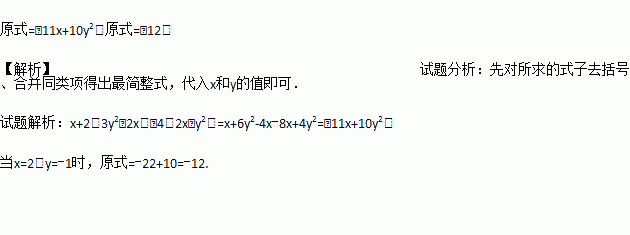 化简后再求值:x+2(3y2﹣2x)﹣4(2x﹣y2),其中x=2,y=﹣1.