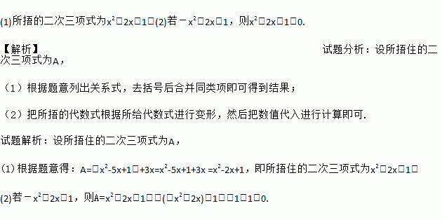 (1)所捂的二次三项式为x2-2x+1;(2)若-x2+2x=1,则x2-2x+1=0. 【解析】试题分析:设所捂住的二次三项式为A, (1)根据题意列出关系式,去括号后合并同类项即可得到结果; (2)把所捂的代数式根据所给代数式进行变形,然后把数值代入进行计算即可. 试题解析:设所捂住的二次三项式为A, (1)根据题意得:A=(x2-5x+1)+3x=x2-5x+1...