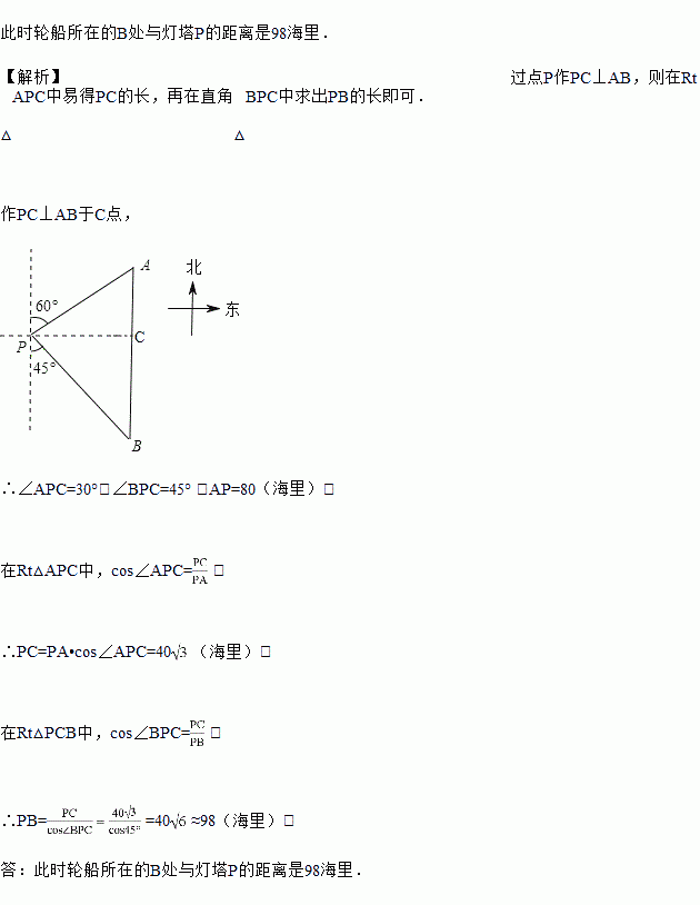 如图,一艘轮船位于灯塔P的北偏东60°方向,与灯塔P的距离为80海里的A处,它沿正南方向航行一段时间后,到达位于灯塔P的南偏东45°方向的B处,求此时轮船所在的B处与灯塔P的距离.(参考数据: