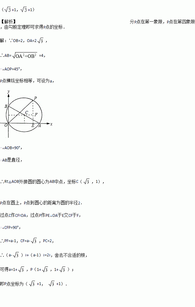 如图,已知A、B两点的坐标分别为、(0,2),P是△AOB外接圆上的一点,且∠AOP=45°,则点P的坐标为 。