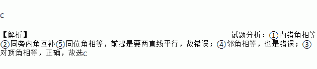 ①内错角相等;②同旁内角互补;③对顶角相等;④邻补角相等;⑤同位角相等.
