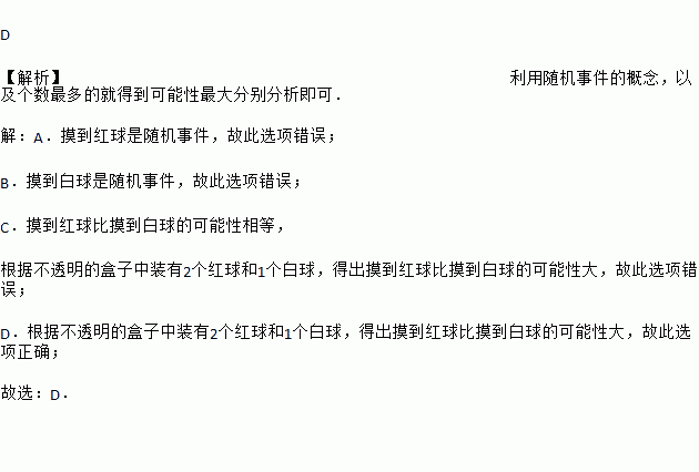 一个不透明的盒子中装有2个红球和1个白球,它们除颜色外都相同.若从中任意摸出一个球,则下列叙述正确的是( )