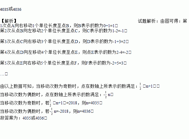 如图,某点从数轴上的A点出发,第1次向右移动1个单位长度至B点,第2次从B点向左移动2个单位长度至C点,第3次从C点向右移动3个单位长度至D点,第4次从D点向左移动4个单位长度至E点,…,依此类推,经过_____次移动后该点到原点的距离为2018个单位长度.