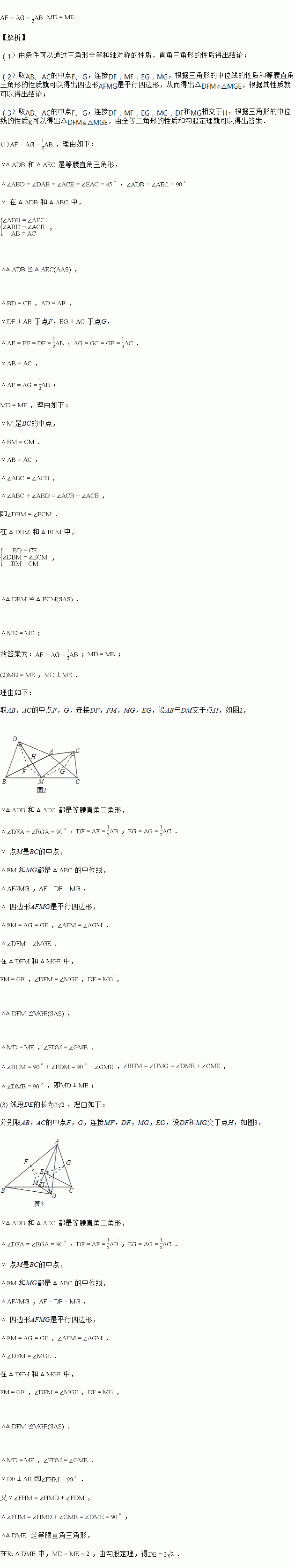 在任意三角形ABC中,分别以AB和AC为斜边向的外侧作等腰直角三角形,如图2所示,M是BC的中点,连接MD和ME,则MD与ME具有怎样的数量关系和位置关系?并说明理由;![]()