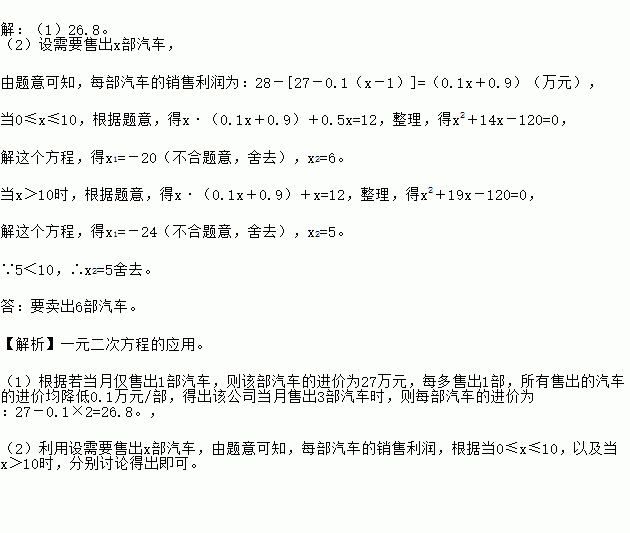 某汽车销售公司6月份销售某厂家的汽车,在一定范围内,每部汽车的进价与销售有如下关系,若当月仅售出1部汽车,则该部汽车的进价为27万元,每多售一部,所有出售的汽车的进价均降低0.1万元/部。月底厂家根据销售量一次性返利给销售公司,销售量在10部以内,含10部,每部返利0.5万元,销售量在10部以上,每部返利1万元。