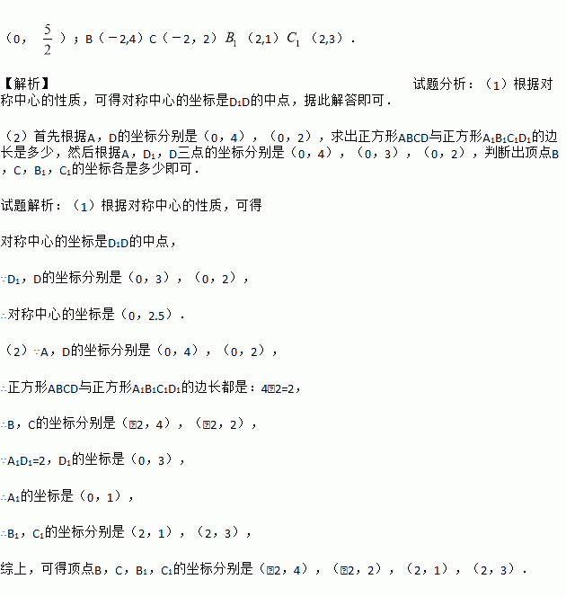 (0, );B(-2,4)C(-2,2)(2,1)(2,3). 【解析】试题分析:(1)根据对称中心的性质,可得对称中心的坐标是D1D的中点,据此解答即可. (2)首先根据A,D的坐标分别是(0,4),(0,2),求出正方形ABCD与正方形A1B1C1D1的边长是多少,然后根据A,D1,D三点的坐标分别是(0,4),(0,3),(0,2),判断出顶点B,C,B1,C1的坐标各是多少即可...实践与操作:一般地,如果把一个图形绕着一个定点旋转一定角度α(α小于360°)后,能够与原来的图形重合,那么这个图形叫做旋转对称图形,这个定点叫做旋转对称中心,α叫做这个旋转对称图形的一个旋转角,请根据上述规定解答下列问题: