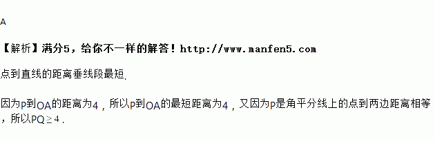 ∠AOB的平分线上一点P到OA的距离为4,Q是OB上任一点,则 ( )