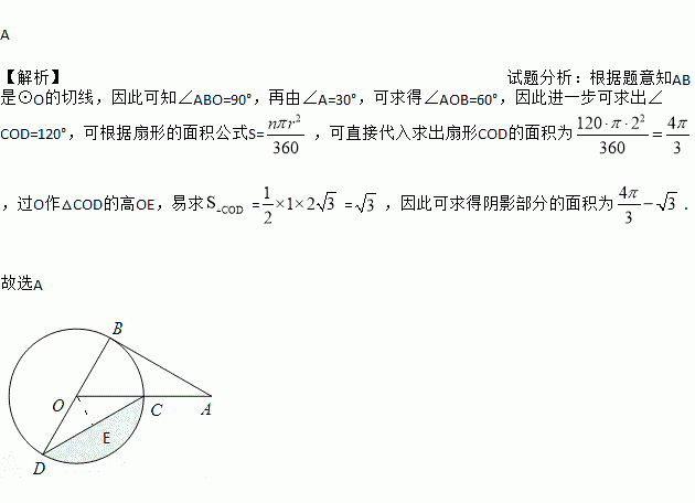 如图,AB为⊙O的切线,切点为B,连接AO,AO与⊙O交于点C,BD为⊙O的直径,连接CD.若∠A=30°,⊙O的半径为2,则图中阴影部分的面积为( )