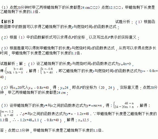 (2)求点燃多长时间,甲蜡烛剩下长度是乙蜡烛剩下长度的1.1倍.