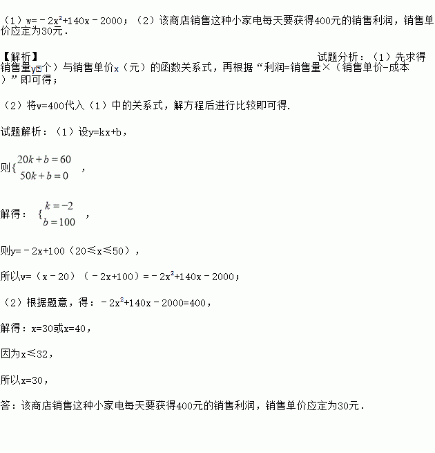(2)如果物价部门规定这种小家电的销售单价不高于32元,该商店销售这种小家电每天要获得400元的销售利润,销售单价应定为多少元?