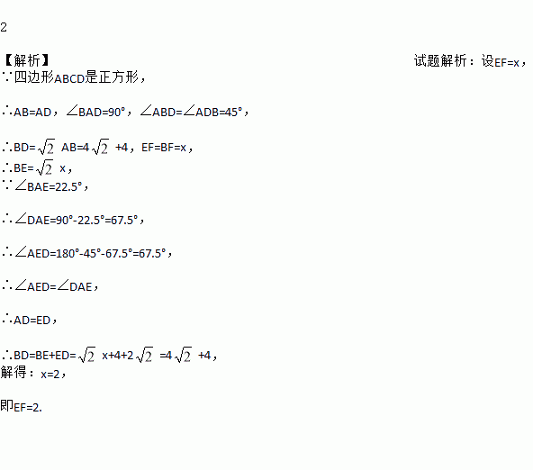 如图,正方形ABCD的边长为4+2,点E在对角线BD上,且∠BAE=22.5°,EF⊥AB,垂足为点F,则EF的长是_____.