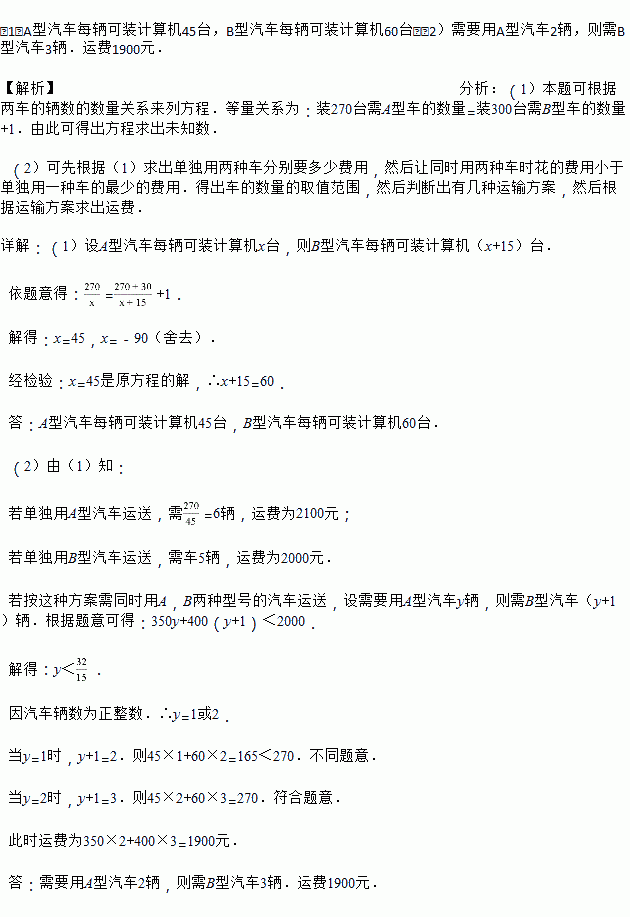 (1)已知B型汽车比A型汽车每辆车可多装15台,求A、B两种型号的汽车各能装计算机多少台?