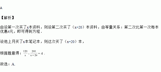 某美术社团为练习素描,他们第一次用120元买了若干本相同的画册,第二次用240元在同一家商店买与上一次相同的画册,这次商家每本优惠4元,结果比上次多买了20本.求第一次买了多少本画册?设第一次买了x本画册,列方程正确的是( )