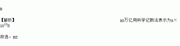 十九大报告指出,我国目前经济保持了中高速增长,在世界主要国家中名列前茅,国内生产总值从54万亿元增长80万亿元,稳居世界第二,其中80万亿用科学记数法表示为( )