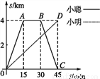 小聪和小明沿同一条路同时从学校出发到某图书馆查阅资料,学校与图书馆的路程是4 km,小聪骑自行车,小明步行,当小聪从原路回到学校时,小明刚好到达图书馆,图中折线O—A—B—C和线段OD分别表示两人离学校的路程s(km)与所经过的时间t(min)之间的关系,请根据图象回答:下列四个结论