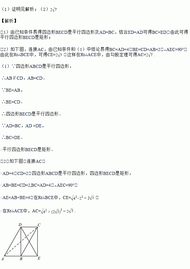 如图,已知□ABCD,延长AB到E使BE=AB,连接BD,ED,EC,若ED=AD.