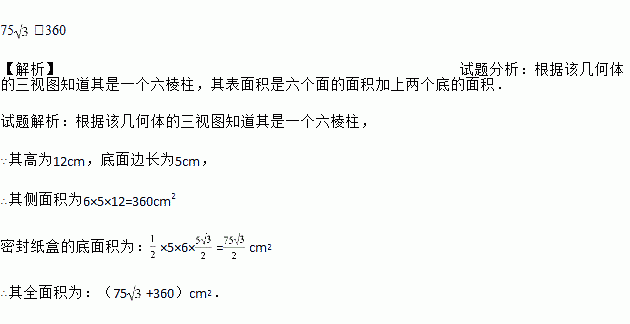如图是一个上下底密封纸盒的三视图,请你根据图中数据,计算这个密封纸盒的表面积为____cm2.(结果可保留根号)