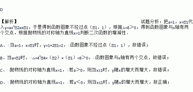 D 【解析】试题分析:把a=1,x=﹣1代入y=ax2﹣2ax﹣1,于是得到函数图象不经过点(﹣1,1),根据△=8>0,得到函数图象与x轴有两个交点,根据抛物线的对称轴为直线x=1判断二次函数的增减性. A、∵当a=1,x=﹣1时,y=1+2﹣1=2,∴函数图象不经过点(﹣1,1),故错误; B、当a=﹣2时,∵△=42﹣4×(﹣2)×(﹣1)=8>0,∴函数图象与x轴有两个交...