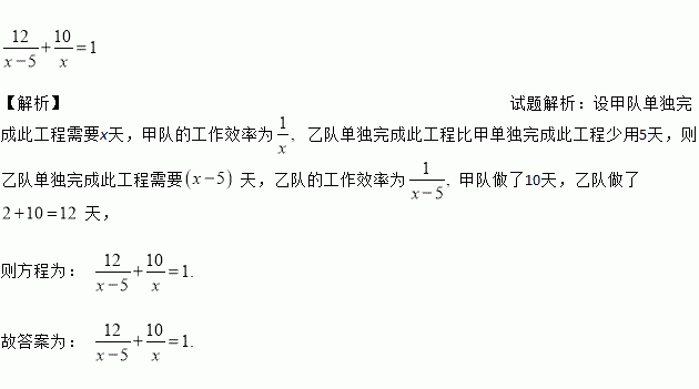 一项工程.乙队先单独做2天后,再由甲乙两队合作10天就能完成.已知乙队单独完成此工程比甲单独完成此工程少用5天.设甲队单独完成此工程需要x天,那么根据题意可列出方程__________________.