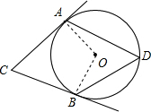 分析:连接OA,OB,根据切线的性质定理以及四边形的内角和定理得∠AOB=104°.再根据圆周角定理得∠D=52°.