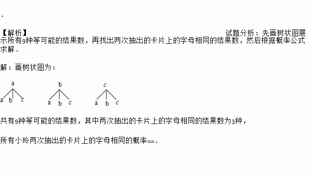 一个不透明的盒子中有三张卡片,卡片上面分别标有字母a,b,c,每张卡片除字母不同外其他都相同,小玲先从盒子中随机抽出一张卡片,记下字母后放回并搅匀;再从盒子中随机抽出一张卡片并记下字母,用画树状图(或列表)的方法,求小玲两次抽出的卡片上的字母相同的概率.