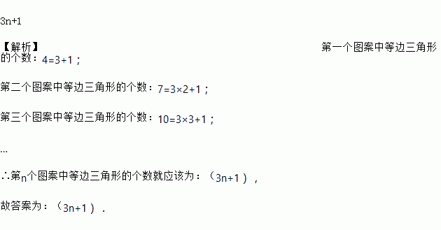 如图,第(1)个图案中有4个等边三角形,第(2)个图案中有7个等边三角形,第(3)个图案中有10个等边三角形,……,以此规律,第n个图案中有____________个等边三角形(用含n的代数式表示).