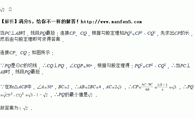 如图,在Rt△ABC中,∠C=90°,∠A=30°,BC=2,⊙C的半径为1,点P是斜边AB上的点,过点P作⊙C的一条切线PQ(点Q是切点),则线段PQ的最小值为_____.