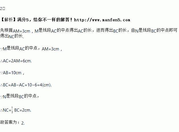 如图,点C是线段AB上一点,点M是线段AC的中点,点N是线段BC的中点,如果AB=10cm,AM=3cm,那么NC=_____cm.