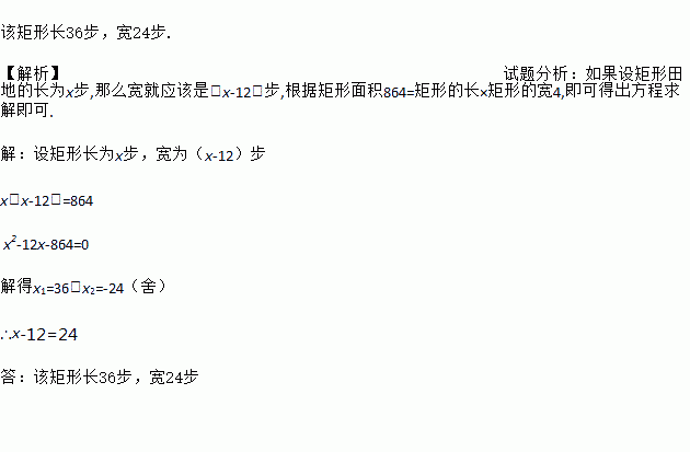 我国古代数学著作《算学宝鉴》中记载了我国南宋数学家杨辉提出的一个问题:“直田积八百六十四步,之云阔不及长十二步,问长阔各几何?”其大意是:“一个矩形田地的面积等于864平方步,且它的宽比长少12步,问长与宽的各是多少步?”试用列方程解应用题的方法求出问题的解。