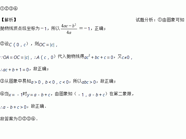 已知:二次函数y=ax2+bx+c的图象如图所示,OA=OC,则由抛物线的特征写出如下含有a、b、c三个字母的等式或不等式:①