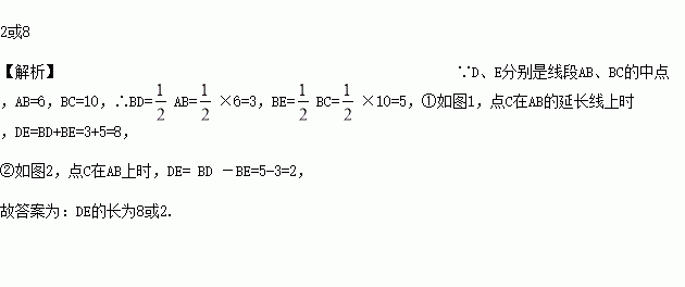 点A、B、C在同一条直线上,AB=6,BC=10,D、E分别是AB、BC的中点,DE的长__