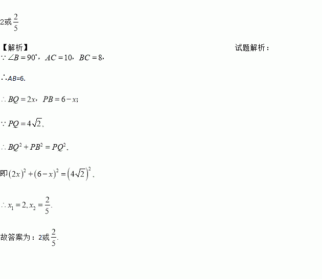 如图,Rt△ABC中,∠B=90°,AC=10cm,BC=8cm,现有两个动点P、Q分别从点A和点B同时出发,其中点P以1cm/s的速度,沿AB向终点B移动;点Q以2cm/s的速度沿BC向终点C移动,其中一点到终点,另一点也随之停止.连结PQ,若经x秒后P,Q两点之间的距离为4