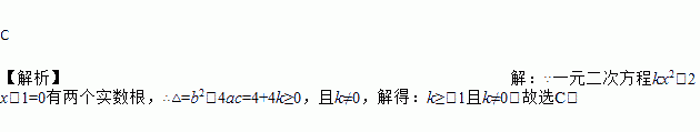 C 【解析】【解析】 ∵一元二次方程kx2﹣2x﹣1=0有两个实数根,∴△=b2﹣4ac=4+4k≥0,且k≠0,解得:k≥﹣1且k≠0.故选C.